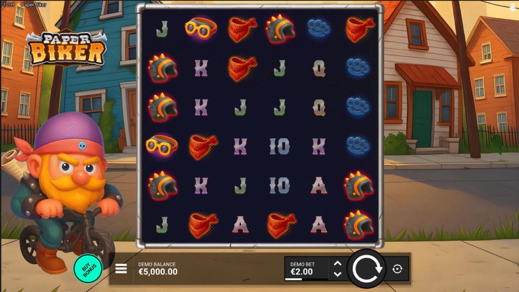 Paper Biker is a slot where you can buy bonus UK and runs on a 6×6 cluster-pay grid with medium-high volatility (4/5) and up to 96.24% RTP, allowing bets from £0.10 to £50 plus optional feature buys. Wins form when five or more matching symbols cluster anywhere, triggering cascading drops that can create consecutive payouts. Lower-value icons include 10–A cards, knuckle dusters, scarves, glasses, and helmets, paying 0.1x–0.5x the stake for small clusters, while clusters of 27 or more can reward 10x–50x. Wild biker symbols stand in for any paying icon to boost winning combinations.